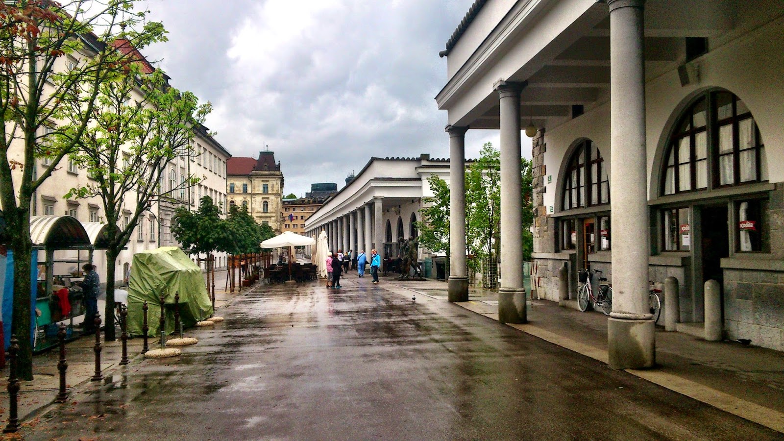 V dešti jsme tedy vyrazili podél řeky přes Pogačarjev trg k autu. Zde najdete spoustu pekáren, kaváren, prodej masa a dalšího zboží.