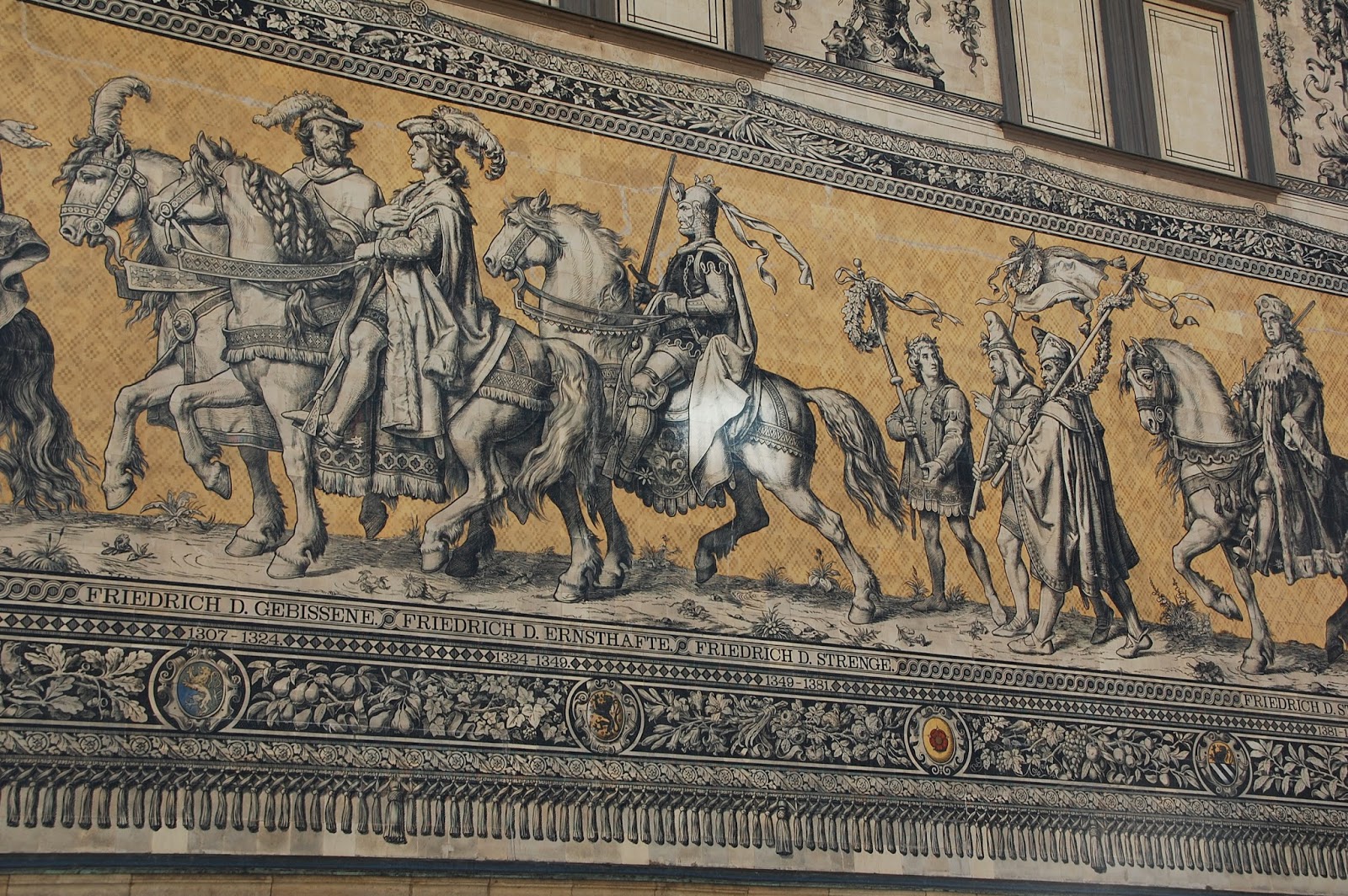 Prošly jsme kolem Knížecího průvodu (Fürstenzug), obrazu složeného z porcelánových kousků, který se nachází v ulici Augustusstrasse.
